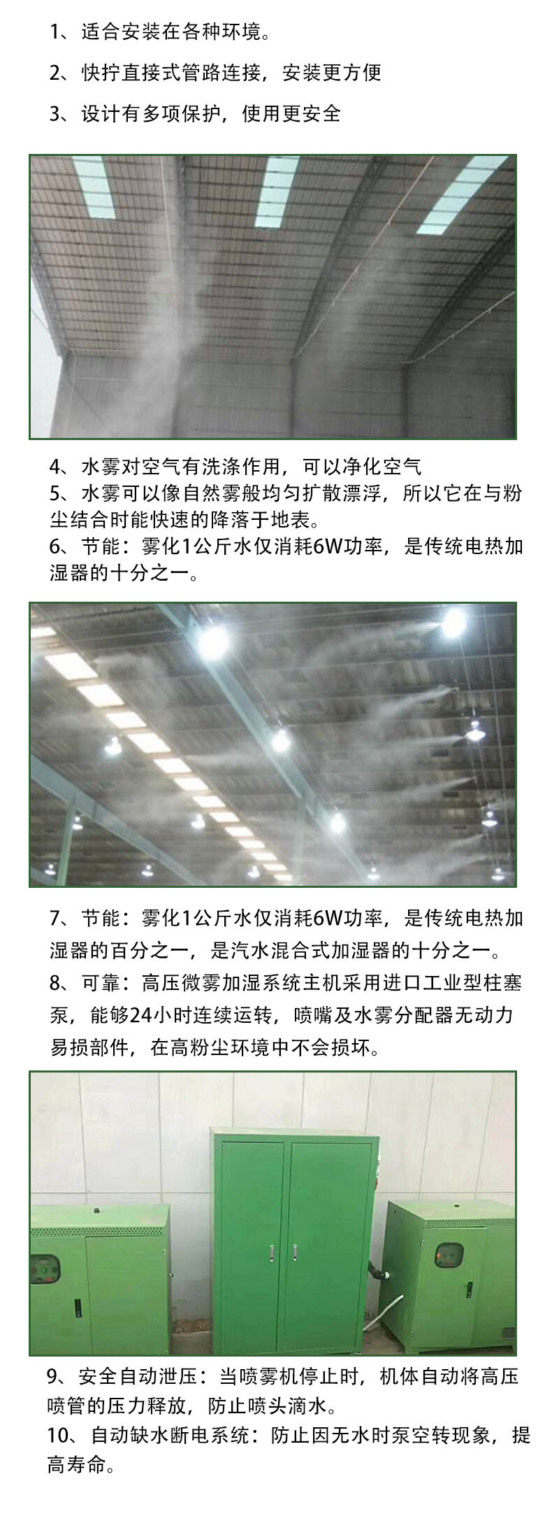 7.可靠:高壓微霧加濕系統(tǒng)主機(jī)采用進(jìn)口工業(yè)型柱塞泵,能夠24小時(shí)連續(xù)運(yùn)轉(zhuǎn),噴嘴及水霧分配器無(wú)動(dòng)力易損部件,在高粉塵環(huán)境中不會(huì)損壞