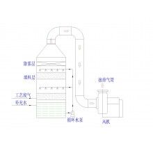 內(nèi)設(shè)逆向填料吸收系統(tǒng)、噴淋系統(tǒng)、脫霧裝置系統(tǒng)、下設(shè)供水箱、供水泵系統(tǒng)、進出風口、風機、風管、吸罩組成系統(tǒng)。