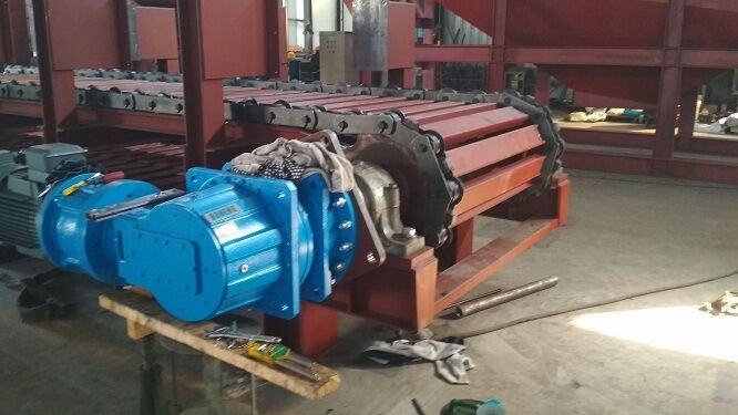 常用齒輥式破碎機(jī)的型號有三種,分別為2NPG1010.2NPG1212和2NPG1414,那么與之相配套的新型板式喂料機(jī)為GBP1000×L, GBP1200×L, GBP1400×L. 其中L為新型板式給料機(jī)頭尾輪中心距,由現(xiàn)場安裝場地大小確定。電機(jī)減速機(jī)的選型由產(chǎn)量確定。