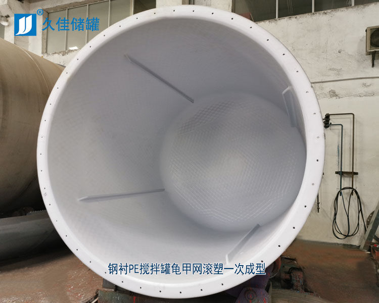 將鋼網(wǎng)(龜甲)焊接于鋼體表面,以改性聚乙烯為原料,采用旋塑工藝(滾塑技術(shù))一次整體成型于鋼體表面。