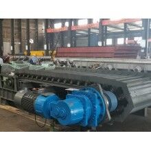 通過分析研究上述問題,結(jié)合國內(nèi)外給料機(jī)使用情況,重新設(shè)計(jì)制作了一臺(tái)新型給料機(jī),主要特點(diǎn)是:采用板式給料機(jī)連續(xù)給料;板式給料機(jī)料板采用雙圓弧、節(jié)點(diǎn)重合的方式,解決了漏料問題;板式給料機(jī)安裝角度為18°,可使物料緩慢分散跌落到皮帶機(jī)上;撥料棍采用逆物料方向旋轉(zhuǎn),以控制物料層的厚度;料斗設(shè)計(jì)采用漸開式,解決了膨料問題;電機(jī)采用變頻控制,可控制出料速度。經(jīng)過三個(gè)多月的的現(xiàn)場使用,證明能夠完成勻料,效果較好。