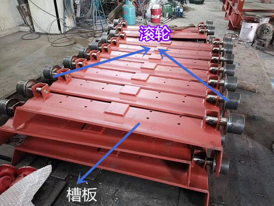 承載構(gòu)件——滾輪采用了滾動(dòng)軸承結(jié)構(gòu),有利于減小運(yùn)行阻力,減少動(dòng)力消耗。該結(jié)構(gòu)型式便于維護(hù)。滾輪由支承座和槽板固定,滾輪在軌道上滾動(dòng),帶動(dòng)槽板和槽板上的物料運(yùn)動(dòng)。