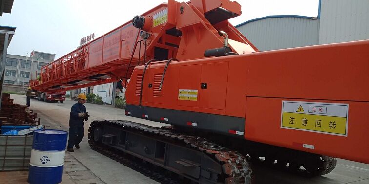 我公司生產(chǎn)的可移動式混凝土運輸、澆筑設(shè)備——自行帶式混凝土布料機,小時澆筑強度可達270m3。為了解決混凝土布料機的供料問題,自行研制了可移動式上料平臺。