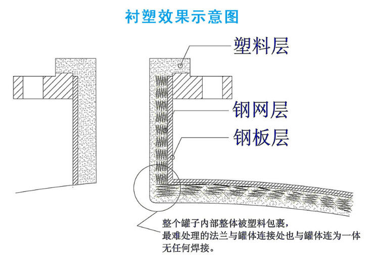 鋼襯塑儲罐是以聚乙烯(PE)為原料,采用旋塑工藝(滾塑技術)一次整體成型。將鋼網(wǎng)焊接于鋼體表面,使鋼體表面、鋼、網(wǎng)、塑復合形成一個整體,這種鋼襯塑儲罐既有高強度物理機械性能又有高強度耐化學腐蝕性能。