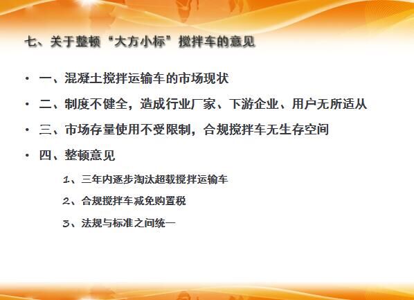 隨后,會(huì)長(zhǎng)分析了攪拌車(chē)的市場(chǎng)現(xiàn)狀,制度不健全,造成行業(yè)廠家、下游企業(yè)、用戶無(wú)所適從,市場(chǎng)存量使用不受限制,合規(guī)攪拌車(chē)無(wú)生存空間;同時(shí)提出了建設(shè)性的整頓意見(jiàn)。