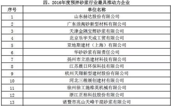 附:2016年度預拌砂漿行業(yè)表彰評比名單