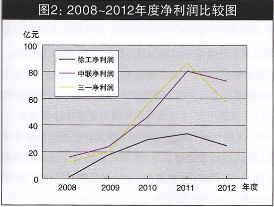 分析工程機(jī)械上市公司三駕馬車5年主要會(huì)計(jì)數(shù)據(jù)表明(見表1):中聯(lián)連續(xù)5年實(shí)現(xiàn)營(yíng)業(yè)收入增長(zhǎng),徐工、三—在實(shí)現(xiàn)4年?duì)I業(yè)收入連續(xù)增長(zhǎng)后,2012年?duì)I業(yè)收入出現(xiàn)負(fù)增長(zhǎng)。從表1可知,三家上市公司凈利潤(rùn)指標(biāo),均在實(shí)現(xiàn)連續(xù)4年上漲后,于2012年同時(shí)出現(xiàn)負(fù)增長(zhǎng)。從圖1、圖2可見三駕馬車2008年、2012年?duì)I業(yè)收入、凈利潤(rùn)排名一致,分別是中聯(lián)、三一、徐工,而在五年中的2009、2010、2011三年,以上排名互有消長(zhǎng)。比較主營(yíng)業(yè)務(wù)十分接近的兩家上市公司三一和中聯(lián),我們發(fā)現(xiàn):在五年之中,當(dāng)GDP增長(zhǎng)率走高時(shí),三一的主營(yíng)業(yè)務(wù)收入增長(zhǎng)率、凈利潤(rùn)增長(zhǎng)率高于中聯(lián),在經(jīng)濟(jì)下行壓力增大,GDP增長(zhǎng)率走低時(shí),中聯(lián)的收入增長(zhǎng),具有相對(duì)穩(wěn)定性(見圖1)。