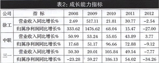 公司的成長(zhǎng)與盈利能力正相關(guān)。在年報(bào)中,主營(yíng)業(yè)務(wù)收入增長(zhǎng)率、凈利潤(rùn)增長(zhǎng)率、凈資產(chǎn)增長(zhǎng)率以及凈資產(chǎn)收益率、毛利率、凈利率等財(cái)務(wù)指標(biāo),是判斷企業(yè)成長(zhǎng)性和盈利能力的重要指標(biāo)。表2顯示,三駕馬車中,5年主營(yíng)業(yè)務(wù)收入同比增長(zhǎng)率實(shí)現(xiàn)連續(xù)5年正增長(zhǎng)、連續(xù)三年保持30%以上增長(zhǎng)率的公司是中聯(lián),五年中增長(zhǎng)率振幅最大的公司是徐工,2012年徐工和三—主營(yíng)業(yè)務(wù)收入增長(zhǎng)率均出現(xiàn)負(fù)增長(zhǎng);表2還顯示,凈利潤(rùn)同比增長(zhǎng)率方面,沒有—家公司連續(xù)五年正增長(zhǎng),2012年三駕馬車同時(shí)出現(xiàn)負(fù)增長(zhǎng),三一錄得-34.26%的最大降幅。在大環(huán)境不利因素作用下,公司成長(zhǎng)性受到嚴(yán)峻挑戰(zhàn)(見圖2)。