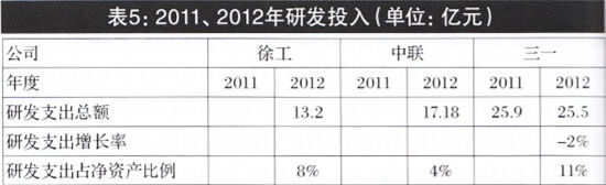 分析2011、2012年報(bào)表明,三一2012年研發(fā)投入25.5億元,占公司凈資產(chǎn)的11%,比2011年減少2%,研發(fā)投入出現(xiàn)下降趨勢(shì);2012年,徐工研發(fā)投入13.2億元,占凈資產(chǎn)的8%;中聯(lián)研發(fā)投入17.18億,占凈資產(chǎn)的4%;徐工、中聯(lián)研發(fā)投入和占比,均低于三一(見表5)。由此可知,在打造公司核心競(jìng)爭(zhēng)力,提升公司價(jià)值方面,三駕馬車研發(fā)投入的趨勢(shì)和占比均存在提升的空間。