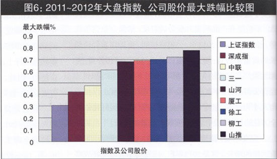 2011年,行業(yè)遭遇寒冬,三駕馬車營(yíng)業(yè)收入合計(jì)增三率與宏觀經(jīng)濟(jì)指標(biāo)對(duì)比,呈加速度下跌態(tài)勢(shì),而且在資本市場(chǎng)的表現(xiàn)弱于滬深大盤指數(shù)。2011年~2012年間,其股價(jià)從最高點(diǎn)至最低點(diǎn),下跌47.3%、61.2%、69.8%不等;而同期上證指數(shù)下跌幅度只有30.67%,深成指下跌42.1%。盡管與行業(yè)內(nèi)其他上市公司同期資本市場(chǎng)表現(xiàn)相比,工程機(jī)械行業(yè)三駕馬車的表現(xiàn)仍有亮點(diǎn),但其同期跌幅大于上證和深成指跌幅,仍然令公司形象受損,影響資本市場(chǎng)再融資能力。因此,打造公司核心競(jìng)爭(zhēng)力,提升公司投資價(jià)值,提振資本市場(chǎng)投資者信心,至關(guān)重要(大盤指數(shù)、公司股價(jià)最大跌幅比較圖,見圖6)。