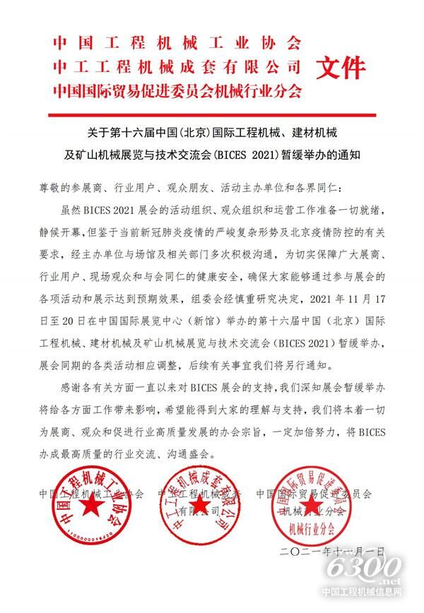 BICES 2021組委會于2021年11月1日下午下發(fā)了關(guān)于第十六屆中國(北京)國際工程機械、建材機械及礦山機械展覽與技術(shù)交流會(BICES 2021)暫緩舉辦的通知,延期時間未定。
