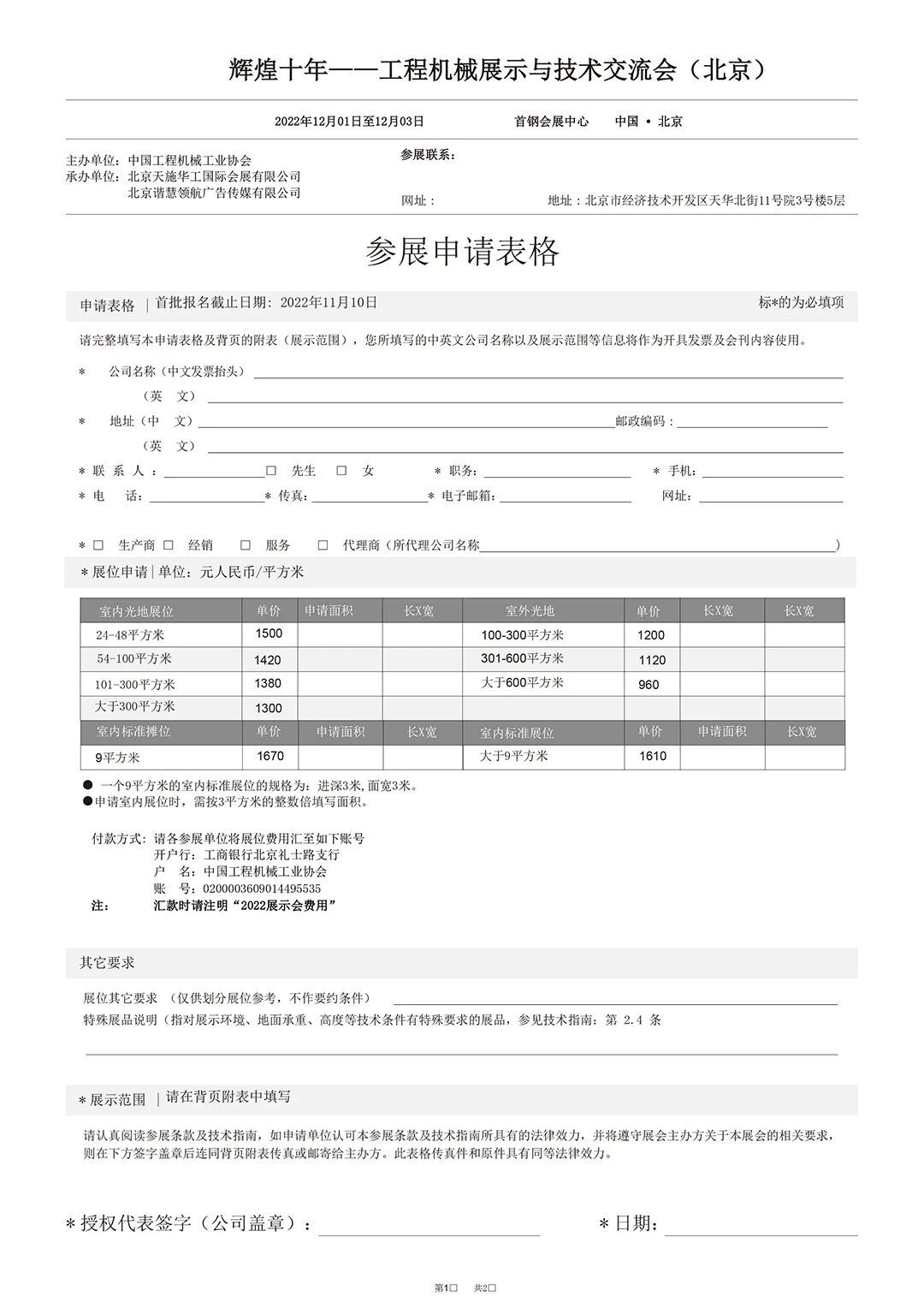 自協(xié)會發(fā)布舉辦“輝煌十年——工程機械展示與技術(shù)交流會(北京)”(以下簡稱“展示會”)通知后,得到了各參展單位的快速響應(yīng)和積極支持,有的已經(jīng)報名大面積參展,有的正在履行審批程序或來電表示參加展出,組委會深表衷心感謝!為及時傳遞展會信息,服務(wù)好廣大展商,辦好本次展示會,現(xiàn)向廣大展商正式發(fā)出邀請,并將有關(guān)展示會方案說明如下:一、為充分展示黨的十八大以來工程機械行業(yè)各領(lǐng)域取得的發(fā)展成就,協(xié)會研究決定召開本次展示會,邀請廣大協(xié)會會員和產(chǎn)業(yè)鏈上下游企業(yè)參展,共同分享企業(yè)發(fā)展成就和謀劃行業(yè)美好未來。二、展示會于2022年12月1日至3日在北京冬奧會滑雪大跳臺項目舉辦地——北京首鋼會展中心舉辦。屆時協(xié)會將邀請政府部門、相關(guān)用戶、媒體朋友和廣大觀眾到展示會現(xiàn)場參觀交流。12月3日(周六)實施社會公眾開放日,讓社會觀眾充分體驗工程機械發(fā)展魅力。三、北京首鋼會展中心適合舉辦室內(nèi)高品質(zhì)展示會,室外面積有限,而且適合承重較輕的產(chǎn)品展出。組委會初步規(guī)劃總展出面積2萬平米左右,希望各參展企業(yè)提供產(chǎn)業(yè)鏈上下游的先進(jìn)技術(shù)產(chǎn)品和高端裝備進(jìn)行展出,大型設(shè)備和示范工程應(yīng)用等可通過模型、圖片、視頻等方式展示。展示會主要目的是系統(tǒng)總結(jié)和全面宣傳十年來行業(yè)企業(yè)發(fā)展成就,參展方式可靈活多樣。四、組委會設(shè)定報名截止日期為2022年11月10日,以便統(tǒng)籌組織好運輸、布展和活動安排,高效推進(jìn)各項運營服務(wù)工作,確保展出效果。五、組委會將展館規(guī)劃為綜合類企業(yè)、專精特新企業(yè)、單項冠軍、高端重器、智能裝備、綠色產(chǎn)品、高端配套、先進(jìn)產(chǎn)業(yè)鏈供應(yīng)鏈等展區(qū),供各參展單位選擇。六、展示會期間組委會將舉辦“中國工程機械行業(yè)高質(zhì)量發(fā)展論壇”及其十多場系列會議、論壇和展示會選樹等活動。七、為便于展商報名和有序確定展位,本文隨附發(fā)布“展商報名表”、“展區(qū)規(guī)劃圖”、“展館示意圖”等,詳見附件。
